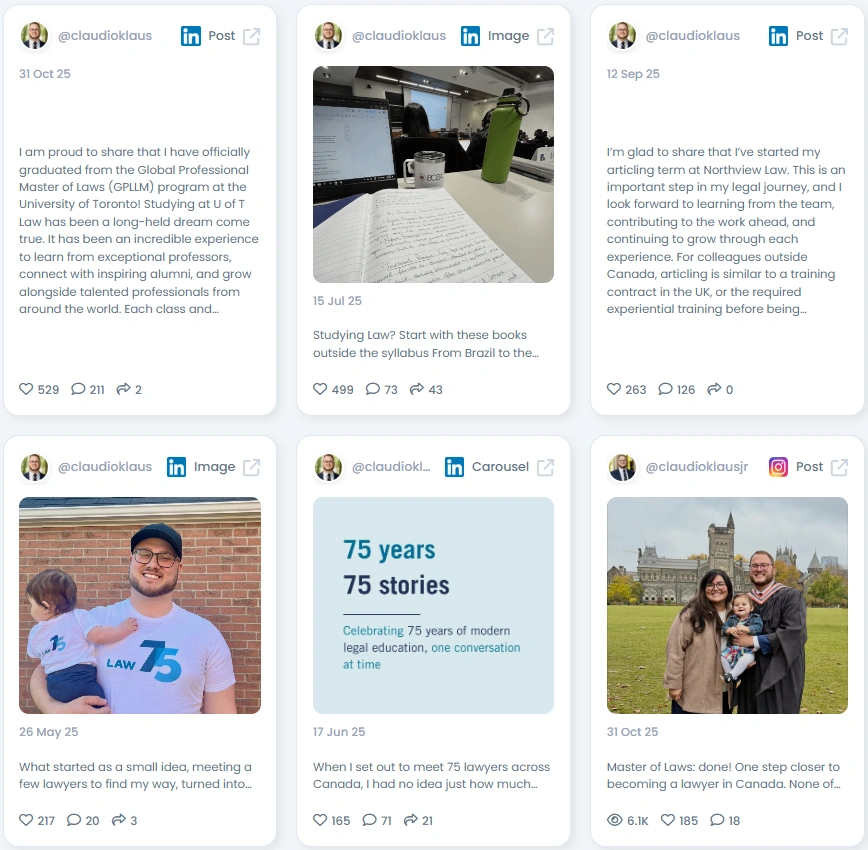 Claudio is a Canadian law student, podcaster, and U of T alum with a deep commitment to legal education. He recently completed the Global Professional Master of Laws program at the University of Toronto, a milestone he openly celebrated with his audience. Before that, he built a presence by documenting his studies, sharing practical advice, and creating conversations through his podcast. His posts often highlight the challenges and triumphs of navigating international law pathways, from articling to licensing. What sets him apart is the way he transforms each milestone into a learning moment for others. Claudio positions himself as a guide for aspiring lawyers who want real insight from someone walking the path in real time.