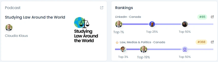 Claudio holds an Influence Score of 6,128 points, placing him in strong positions across multiple rankings. He reaches the Top 1 percent on LinkedIn in Canada and sits in the Top 13 percent worldwide for Law and Justice. His follower base continues to grow steadily from 10.8K to over 13.5K with no irregular spikes. Engagement quality sits at an impressive 92 percent, driven by meaningful conversations rather than generic likes. His posting rhythm mixes announcements, educational posts, and personal stories that consistently land.
