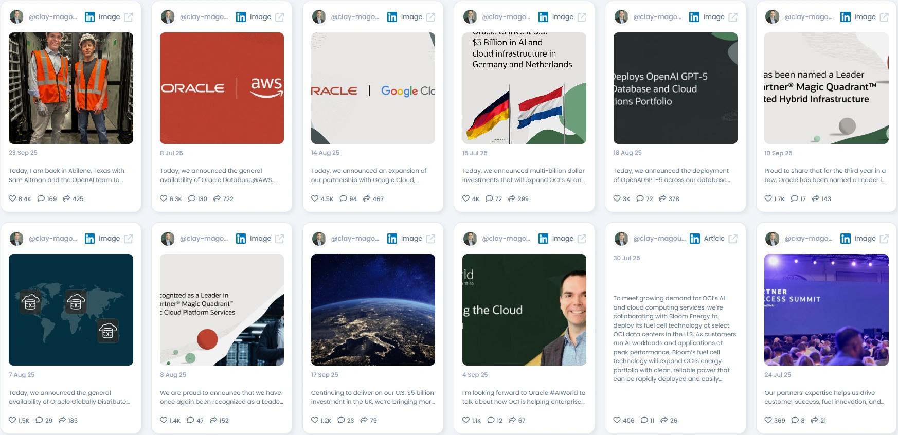 People listen to Clay because his communication style is direct, precise, and grounded in real expertise. He doesn’t rely on vague hype. His posts often include concrete figures, geographic expansion details, and technical specs. His updates feel like inside access to Oracle’s biggest moves, whether it’s a new AI deployment or billion-dollar investments. Professionals engage because they get both the high-level strategy and the technical credibility behind it.