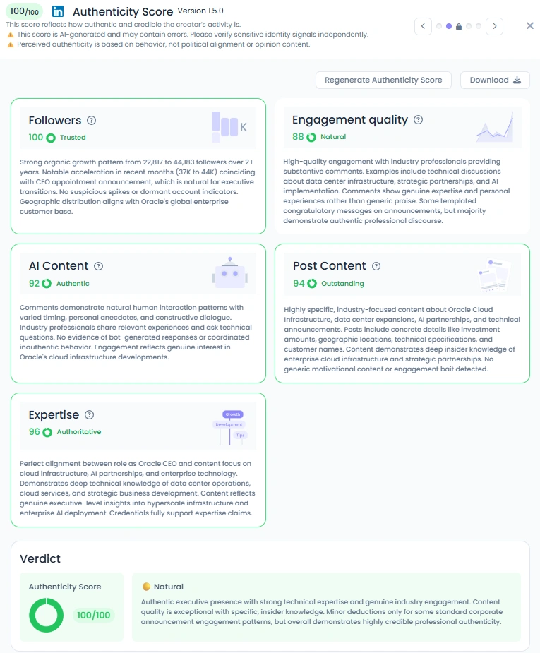 Clay scores a perfect 100/100 Favikon Authenticity Score, and it shows. His growth is fully organic, fueled by executive announcements and industry interest, not artificial spikes. Comments on his posts reflect genuine professional dialogue, from engineers discussing data centers to executives reacting to partnerships. His mix of personal appearances, behind-the-scenes moments with leaders like Sam Altman, and highly technical insights strikes a balance that feels both authoritative and approachable.
