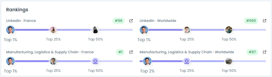 Clément has grown from 13,287 to over 38,900 followers in just over two years with consistent, healthy acceleration. His posts often reach thousands of reactions and comments from professionals engaging in meaningful discussions. He holds a Favikon Influence Score of 7,455 points, placing him in the Top 1 percent in France and Top 2 percent worldwide in Manufacturing, Logistics, and Supply Chain. His regular publishing rhythm keeps his audience active and loyal, strengthening his position as a go-to expert.