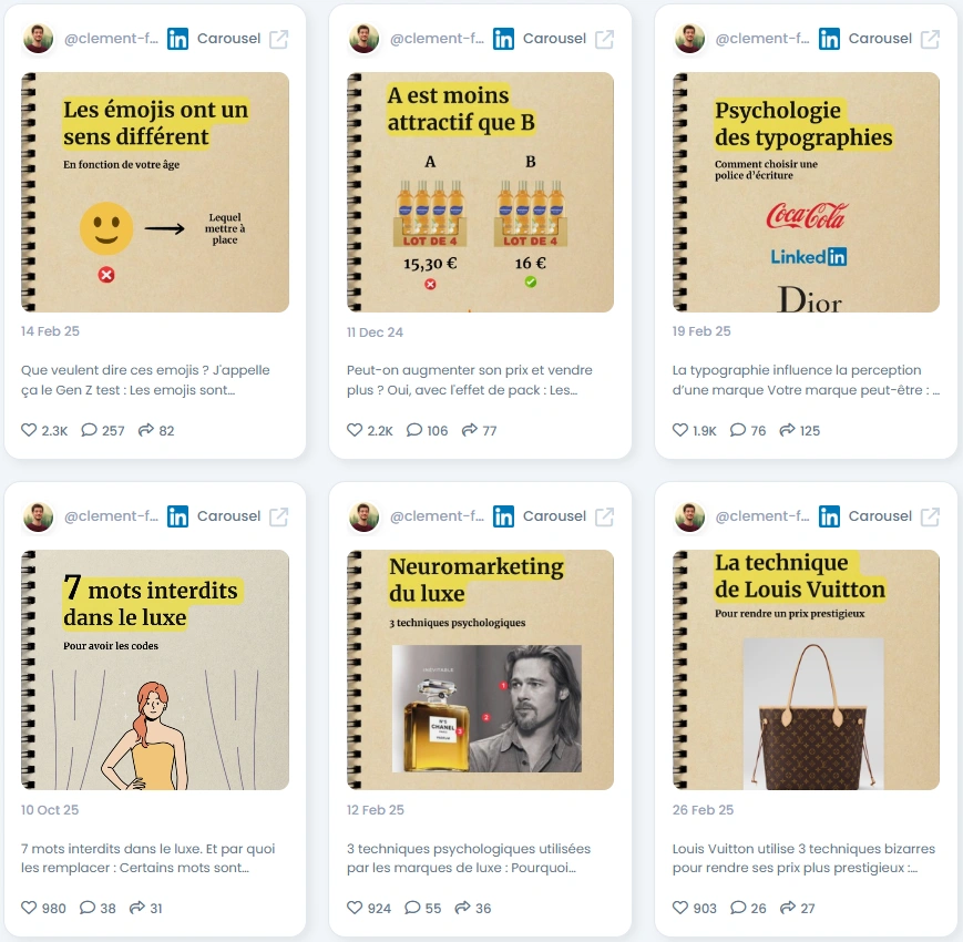 People listen to Clément because he makes psychology feel practical. His signature carousel posts use simple visuals, familiar examples, and humor to explain why people buy, click, and react. Instead of abstract theory, he delivers insights that marketers can apply instantly. His tone is friendly and curious, making technical topics like cognitive bias or pricing perception feel like light reading. Audiences trust him because he teaches without preaching, showing that data can be both useful and fun.