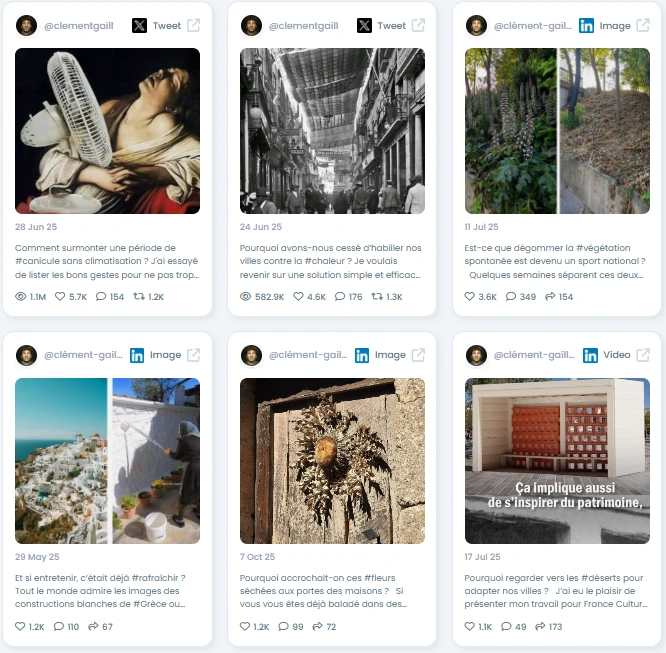 Clément explains complex climate and design topics in short, usable pieces. He pairs technical insight with images from the field and simple diagrams people can reuse. His tone is pragmatic and slightly playful, so readers feel able to act rather than just worry. That mix of usefulness and clarity makes his posts highly shareable among professionals.