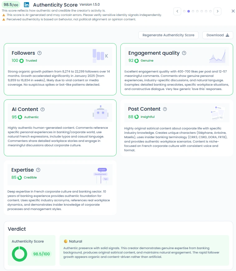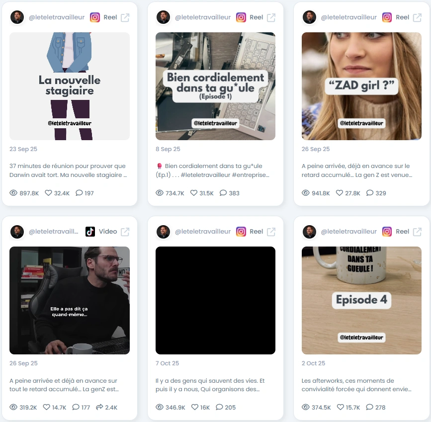 With a Favikon Authenticity Score of 98.5/100, Clovis is one of the most trusted voices in French comedy. His growth from 8,274 to over 22,000 followers in 14 months was entirely organic. Each post shows genuine interactions, with thousands of likes and detailed comments referencing real office situations. His humor feels natural because it’s grounded in observation, not performance. Viewers recognize his world and see their own stories reflected in it.
