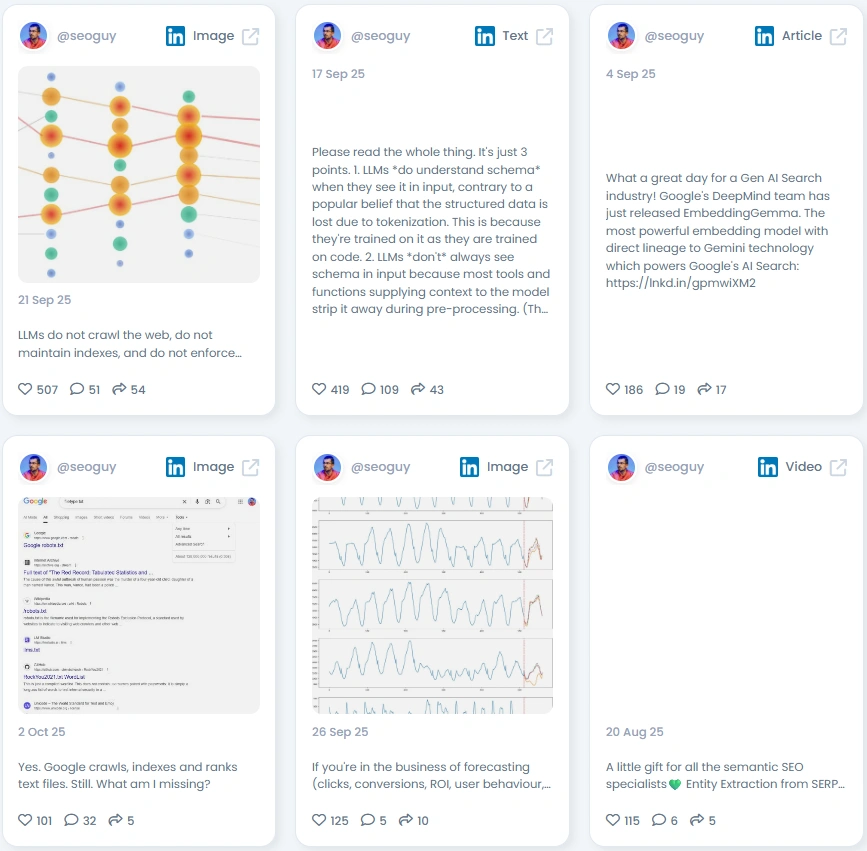 Dan’s Favikon Authenticity Score of 100/100 says it all. His followers grow organically and his comments are filled with thoughtful debates from genuine industry professionals. His posts show no sign of automation or trend-chasing. Instead, they focus on experiments, insights, and real results. Every discussion on his feed feels like a peer-to-peer exchange rather than a broadcast. This commitment to transparency and technical rigor has earned him a reputation as one of the most trusted figures in SEO.