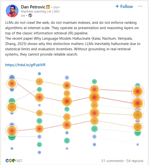 Dan’s network includes some of the most influential minds in SEO and tech. His professional circle features experts like Rand Fishkin, Barry Schwartz, Lily Ray, and brands such as Semrush, DeepMind, and LinkedIn. He’s also connected to leading AI researchers and analytics professionals, forming a bridge between data science and marketing. This wide network reflects his role as both a technical authority and a collaborative voice in the global search community.