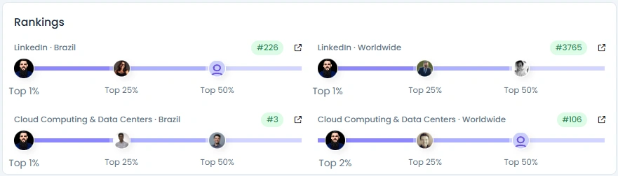 Dan is a top expert in his field, ranked in the Top 1% of all LinkedIn accounts worldwide. His Influence Score is 5 (6,780 pts). In the Cloud Computing & Data Centers category, he ranks in the Top 3 in Brazil and Top 2% worldwide. His follower growth is Trusted (100) over two years, reflecting consistent engagement patterns.
