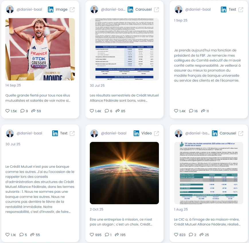 Daniel Baal counts nearly 69,000 followers on LinkedIn, ranking in the Top 1% of creators in France and Top 3 in the French Banking & Consulting Industry. His posts regularly receive over 1,000 reactions and dozens of meaningful comments from peers and professionals. With an Influence Score of 7,917 points and consistent engagement quality, he stands out as a leader in the digital finance community and serves as a clear example of how credibility drives influence.