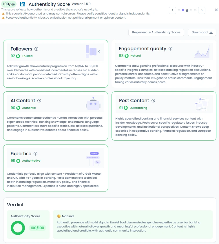 With a Favikon Authenticity Score of 100/100, Daniel’s digital presence is the definition of credible leadership. His follower growth is steady and organic, and his audience engages with thoughtful, professional dialogue. His posts attract discussions about financial policy, sustainability, and cooperative governance, not empty praise. The balance of technical insight and genuine connection makes his voice one of the most trusted in European banking.