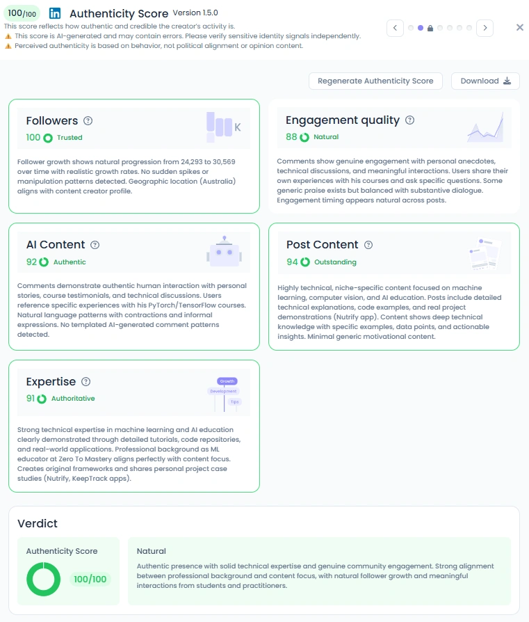 Daniel holds a perfect 100 Authenticity Score which fits his style perfectly. His feed is full of real discussions, course testimonials, behind-the-scenes experiments, and casual snapshots of projects he's coding at home. Comments show genuine curiosity from students and practitioners who ask specific technical questions. His tone is informal and honest. No templated responses. No empty hype. Just a builder talking about the craft.