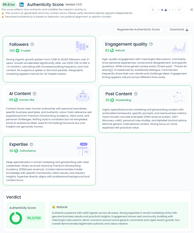 Daniel holds a Favikon Authenticity Score of 95.5/100, a reflection of genuine, hands-on content. His growth from 3,600 to over 26,000 followers in two years came from consistent engagement and credible insights. His posts feel human and conversational, filled with screenshots, metrics, and examples that keep readers hooked. There is no fluff or generic advice, just clear steps anyone can follow.