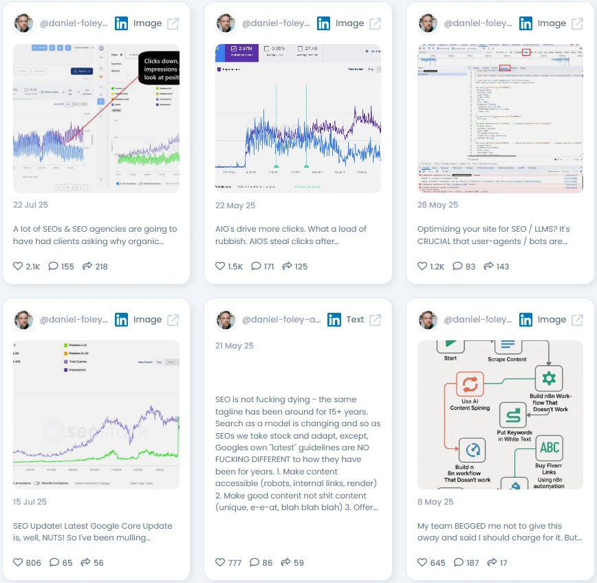 Daniel maintains an excellent Favikon Authenticity Score of 97.5/100, establishing him as a genuine SEO expert with strong technical content. His writing style is consistent, conversational, and often includes personal opinions, industry rants, and authentic voice. For example, he uses strong, colloquial language in his posts to demonstrate frustration with industry trends, making him incredibly relatable. The combination of his transparent, data-heavy posts with a human writing style ensures he balances high authority with genuine, direct communication.