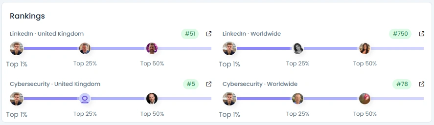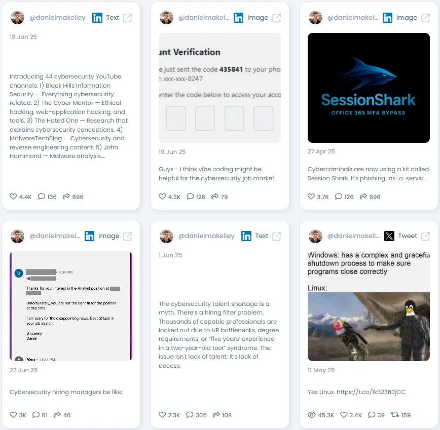 Daniel has an Influence Score of 8,096 points, placing him in the Top 1% of LinkedIn creators in the UK and the Top 5 globally in Cybersecurity. His following has grown organically from 87,000 to 116,000, showing sustained trust and engagement. His content consistently goes viral across LinkedIn and X, with thousands of reactions and hundreds of thoughtful comments per post. With an Engagement Quality score of 88 and a Post Content score of 92, Daniel’s metrics confirm what his community already knows. He’s one of the most authentic voices in cybersecurity education.