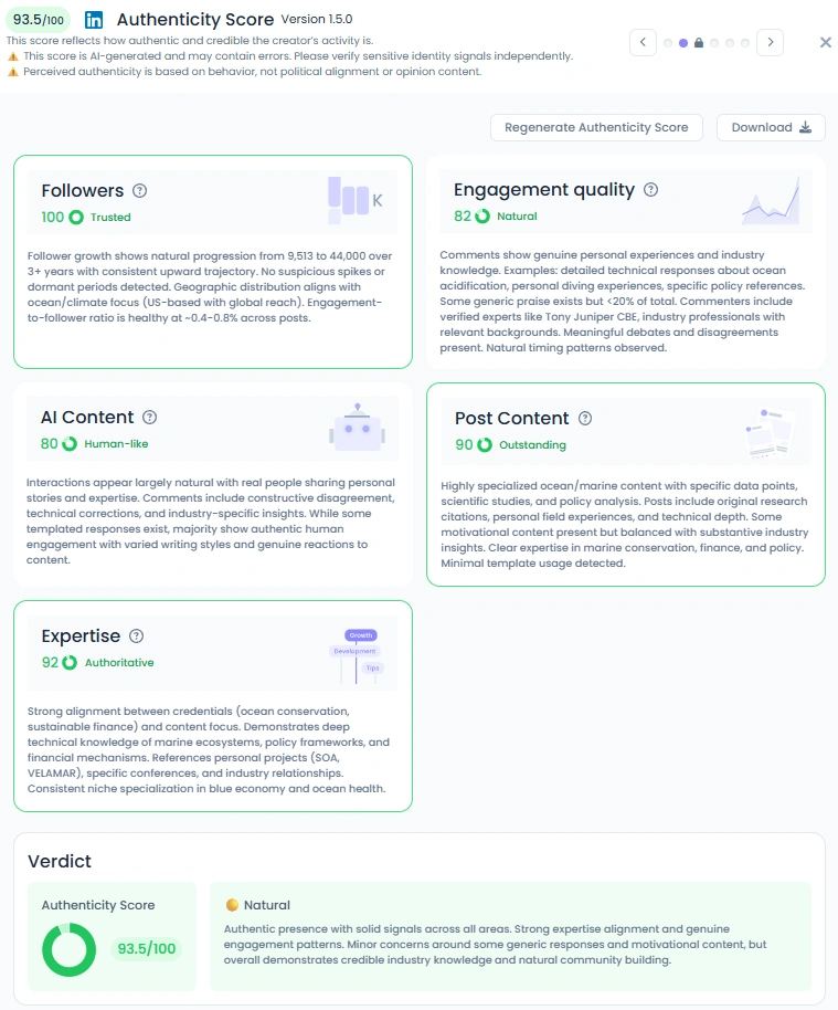 Daniela’s influence is solid and growing. She has over 44K followers on LinkedIn. Her content features a consistent activity of 5 posts per month. Her Engagement Quality is 82 (Natural), and she holds an impressive Influence Score of 5 (6,983 pts). She's a Top 1% ranked LinkedIn creator in the US and a Top 6% Climate Activist & Entrepreneur in the US.