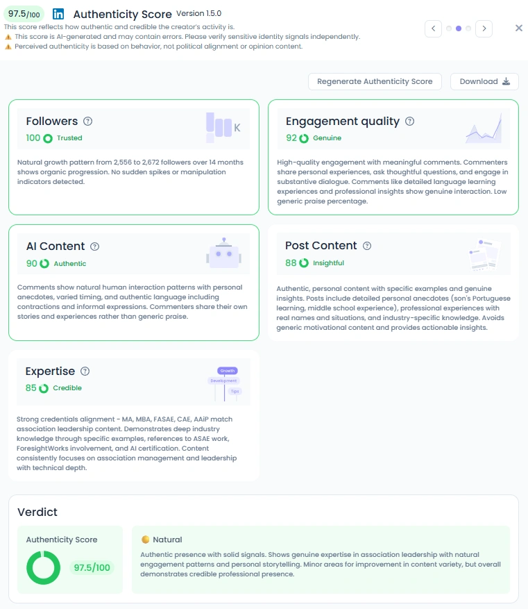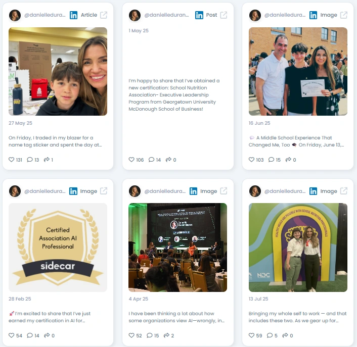 Favikon gives Danielle a 97.5 out of 100 Authenticity Score. Her activity shows consistent, human engagement with thoughtful comments and real stories. She posts photos from events, shares personal learning moments, and highlights team wins. That mix of professional achievement and candid reflection makes her both credible and relatable.