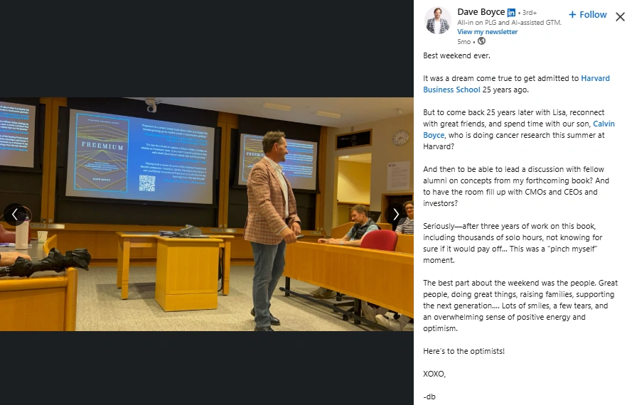 Dave Boyce writes and speaks like someone who has built and led products. He blends contrarian views with practical frameworks that help go to market teams win. His posts mix book notes, event recaps, and blunt advice for founders and CMOs. People follow him because his experience is real and his takeaways are usable.