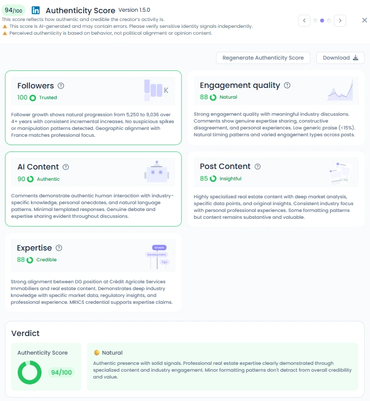Favikon scores David 94 out of 100 for authenticity. His feed shows real professional interactions, not generic promo. He shares infographics, campaign visuals, and commentary on current debates. Comments include constructive disagreements and specialist feedback. That mix of transparency and domain knowledge strengthens his credibility.