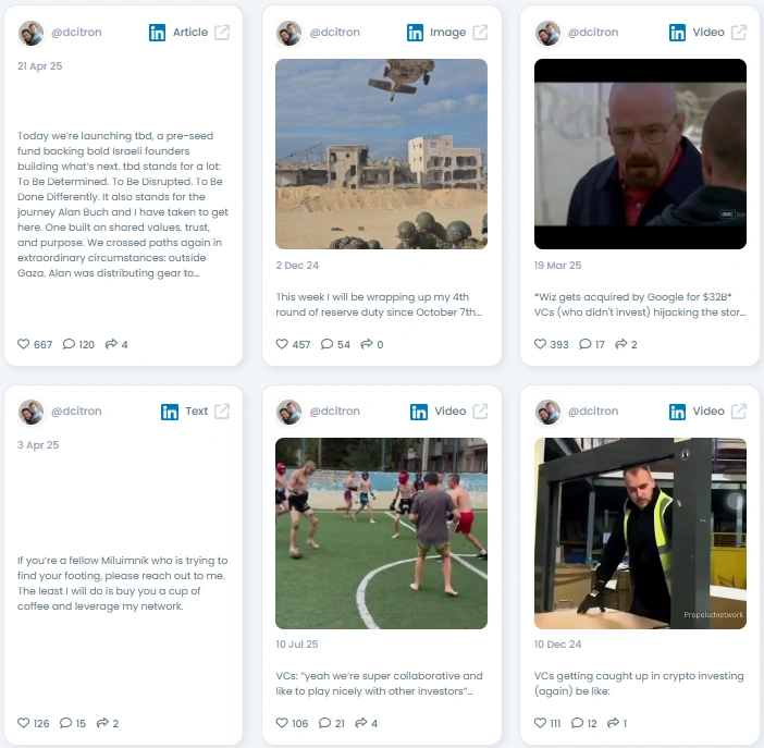 People follow David because he speaks plainly. His tone mixes humor with hard truths and warm, grounded storytelling. He shares real lessons from boardrooms, battlegrounds, and the Israeli ecosystem without over-polishing anything. This makes his insights feel both practical and personal. When he posts, he sounds like someone who is genuinely living the stories he tells.