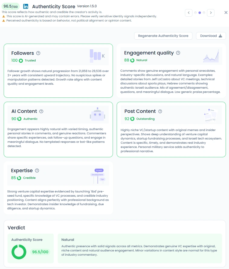 With a Favikon Authenticity Score of 96.5/100, David’s content is the definition of real. His posts include candid reserve-duty updates, behind-the-scenes moments from startup life, and personal snapshots of community and family. Comments come from credible industry peers who add technical depth, personal disagreement, and real conversation. His authenticity shows up in everything from memes about VC culture to reflective notes on leadership during conflict. Nothing feels templated.
