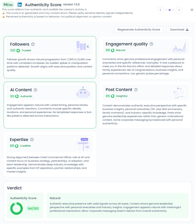 Favikon pegs his authenticity at 94/100. Engagement shows real colleagues, partners, and customers swapping stories with dates and places. Posts mix leadership moments with family notes and behind-the-scenes clips. There is corporate polish, but the person shows up first.
