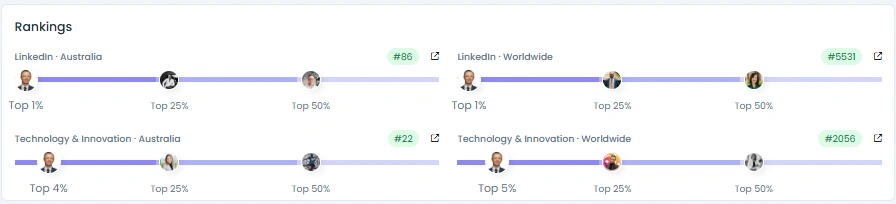 Influence score: 6,047 points. Followers grew organically from about 7,266 to 12,460 with steady increases and no odd spikes. Engagement quality scores 88 and post content lands at 85, supported by industry specifics and personal anecdotes. Rankings place him in the top 1% on LinkedIn in Australia (#86) and top 4% for Technology and Innovation in Australia (#22).