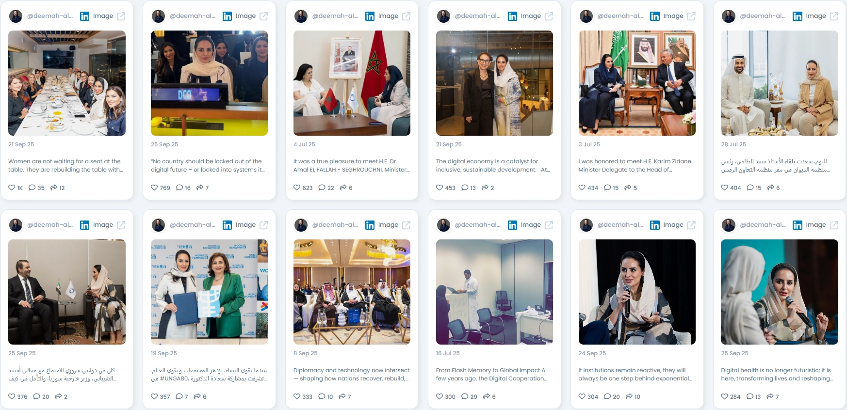 With an Favikon Authenticity Score of 100/100, Deemah’s voice is as genuine as it gets. Her posts reference real-world meetings, diplomatic exchanges, and concrete milestones. Whether it’s sharing a moment from the UNGA or discussing the future of digital health, her content remains consistent with her professional role and values. No templated posts and no generic motivational fluff, only authentic insights grounded in lived experience.