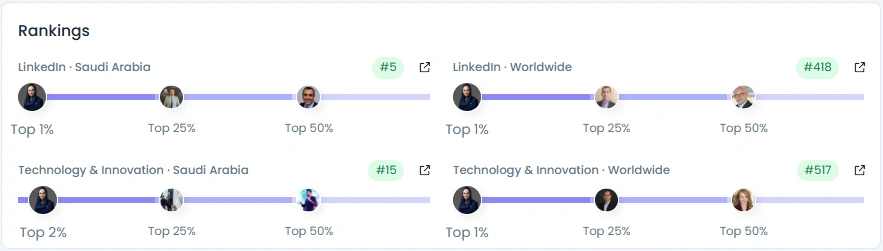 Deemah has grown her LinkedIn following from 42K to 67K in just 15 months, with visible boosts during major diplomatic events. Her Influence Score is 8,064 points, placing her in the top 1% on LinkedIn in Saudi Arabia and among the top 15 voices in Technology & Innovation in the region. With high-quality content engagement and consistent visibility, her growth reflects both credibility and influence.