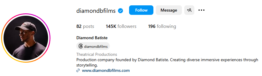 Diamond is also vocal about motivation and discipline, using captions and occasional videos to reflect on personal growth. His bio quote—“Dreams don’t come true when you sleep, so wake the hell up and get about it”—sums up his tone: driven, blunt, and unapologetically focused. This ethos shapes how he builds community, not through trend-hopping but through consistent, narrative-first storytelling. His identity as both a performer and filmmaker makes him one of the few creators bridging social media with cinematic intent.
