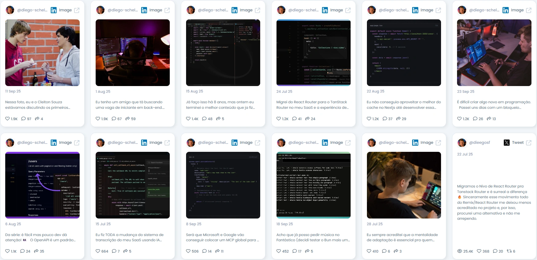 People follow Diego because he talks like one of them. His posts aren’t abstract lessons but personal insights from someone still writing code, still experimenting, and still learning. Whether breaking down React Router updates or sharing real struggles with motivation, he keeps his tone honest and relatable. Developers connect with his mix of authenticity, curiosity, and teaching spirit, making his content as educational as it is human.