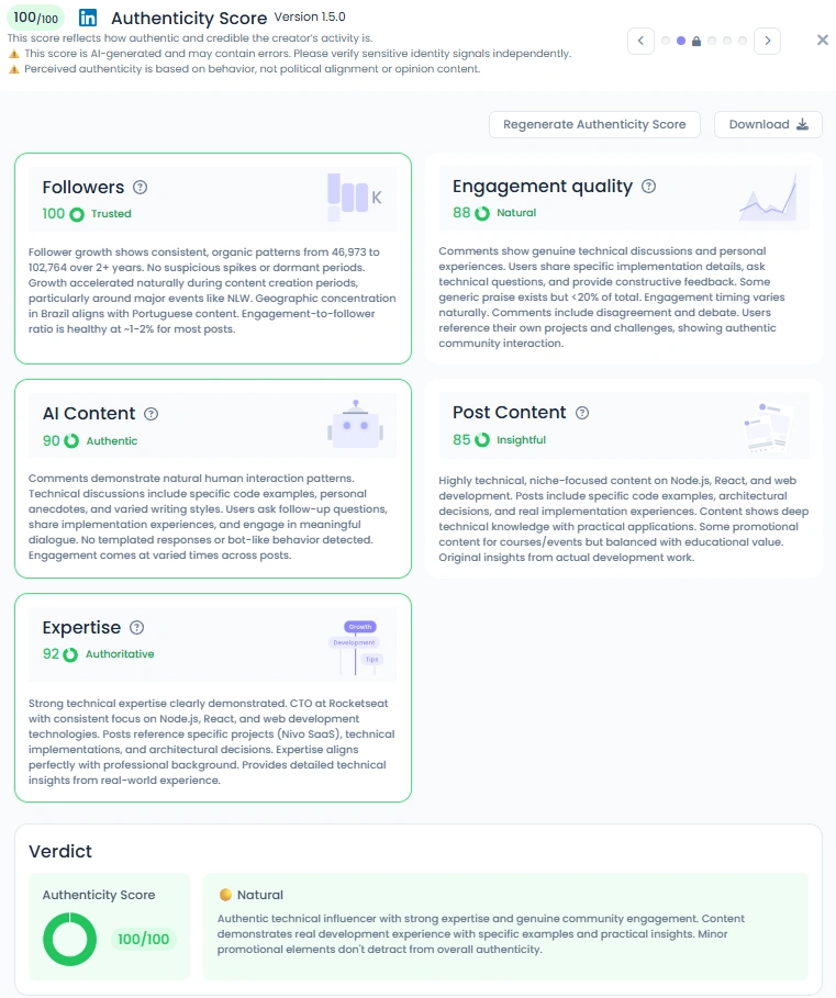 With an Favikon Authenticity Score of 100/100, Diego embodies what it means to be a genuine creator. His content shows the real side of programming, late-night coding sessions, bugs, small wins, and shared community milestones. The engagement he receives feels organic, with real developers asking questions, sharing insights, and discussing implementation details. His mix of educational depth and casual openness proves that authority doesn’t mean losing personality.