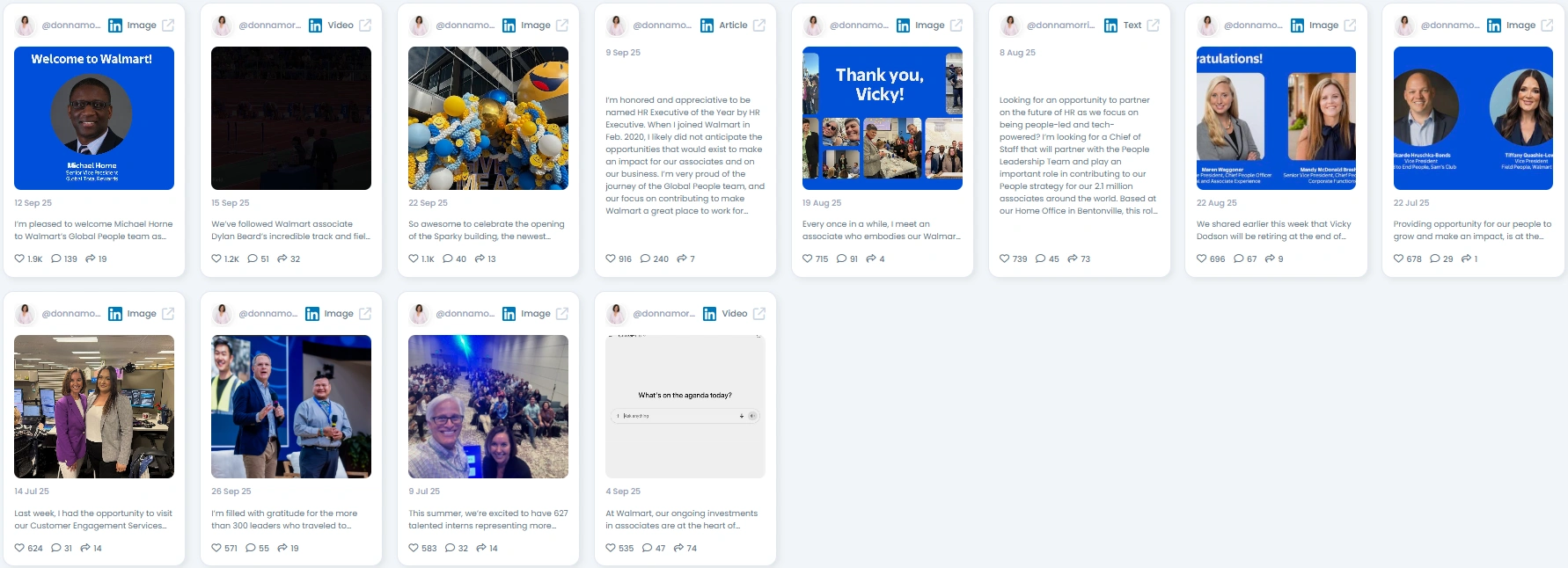 She keeps it human and specific. Short posts, real names, clear numbers. She celebrates promotions, welcomes new executives, and highlights programs like internships and customer care investments. It reads like an inside look at how a massive employer builds momentum.