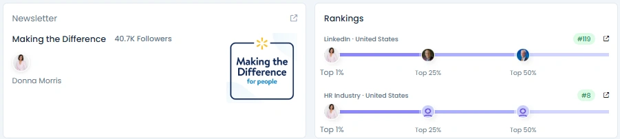 Influence Score: 8,119 pts. Followers grew from 75K to 103K over two plus years with steady, organic patterns. Post Content is 87 (Insightful) and Expertise 89 (Credible). Rankings place her Top 1% on LinkedIn in the US (#119) and #8 in the US HR Industry. She also runs the LinkedIn newsletter “Making the Difference” with 40.7K followers.