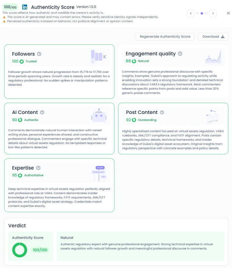 Her follower growth rose naturally from around 15,778 to 17,756, reflecting long term credibility rather than spikes. Her influence score sits at 5,409 points, and her engagement quality is rated Natural. Post content scores extremely high thanks to detailed regulatory insights and high specialization. She posts regularly around panels, government preparations, and compliance discussions.