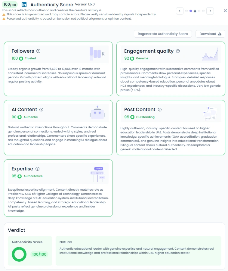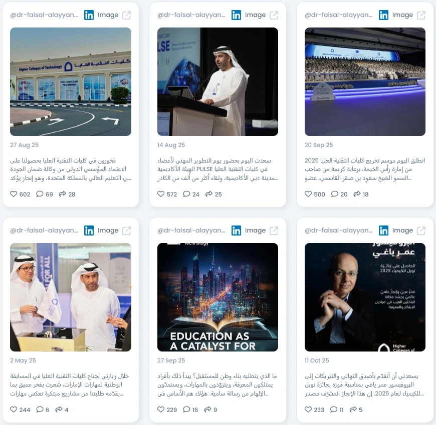 Dr. Faisal’s follower base has grown from 6,630 to 13,566 within just 18 months, showing a steady and organic trajectory. His Influence Score of 6,679 points places him in the Top 1% in the UAE and Top 2% in Technology & Innovation nationwide. His engagement quality stands at 92/100, supported by thoughtful interactions from verified professionals in education and technology. His Expertise Score of 95/100 confirms his authority as a trusted voice in academic innovation.