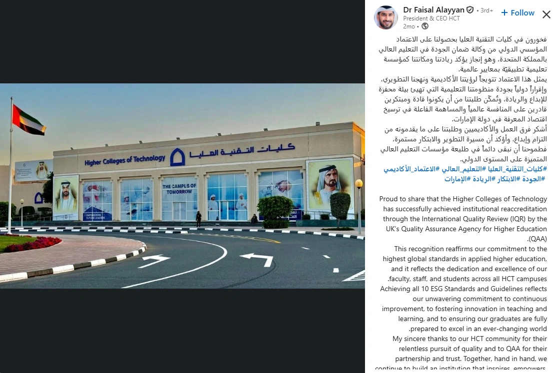 Dr. Faisal’s work involves partnerships that directly shape the UAE’s educational future. His collaborations include the Higher Colleges of Technology, where he leads institutional transformation and national learning initiatives, and the UAE Ministry of Education, where he supports strategy and policy development. He also works with the Dubai Future Foundation and various accreditation agencies to align education with innovation and global academic standards.