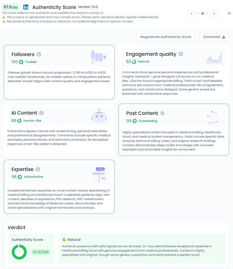 Margaret’s Favikon Authenticity Score is 97.5/100, reflecting strong, consistent signals across her activity. Her posts include original analysis, case studies, and firsthand accounts from clinicians and patients. Engagement includes technical corrections and professional discussion rather than just praise. That pattern shows an audience that trusts her evidence and returns for guidance.
