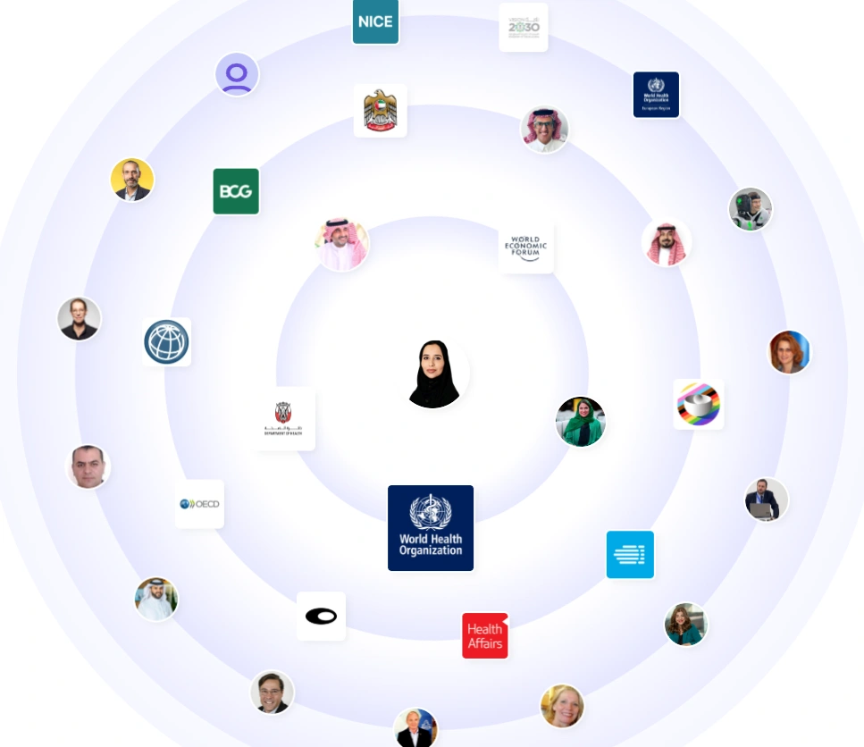 Dr. Sara’s network is built around the most influential institutions in global health and economics. Her connections span organizations like the World Health Organization, World Economic Forum, Harvard Business School, BCG, and the Abu Dhabi Department of Health. She also collaborates with regional entities shaping the Gulf’s healthcare policies, including the UAE Ministry of Health and the Saudi Vision 2030 Health Initiative. Her proximity to decision-makers and institutions reflects both trust and credibility in international health discourse.