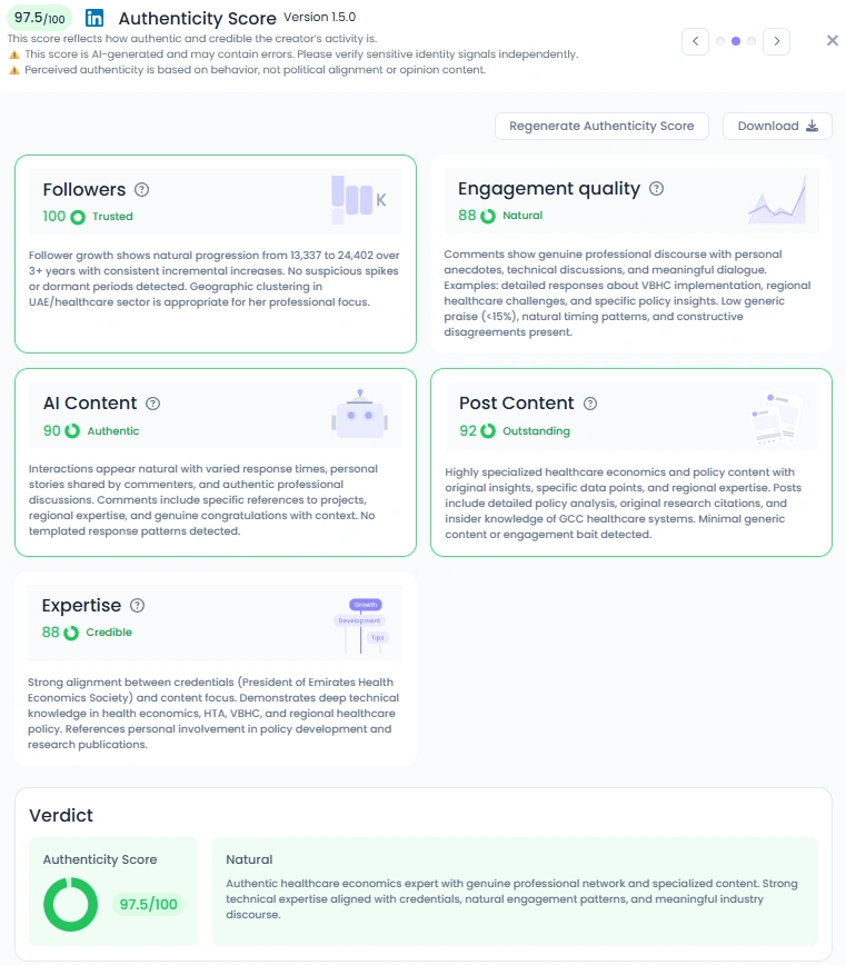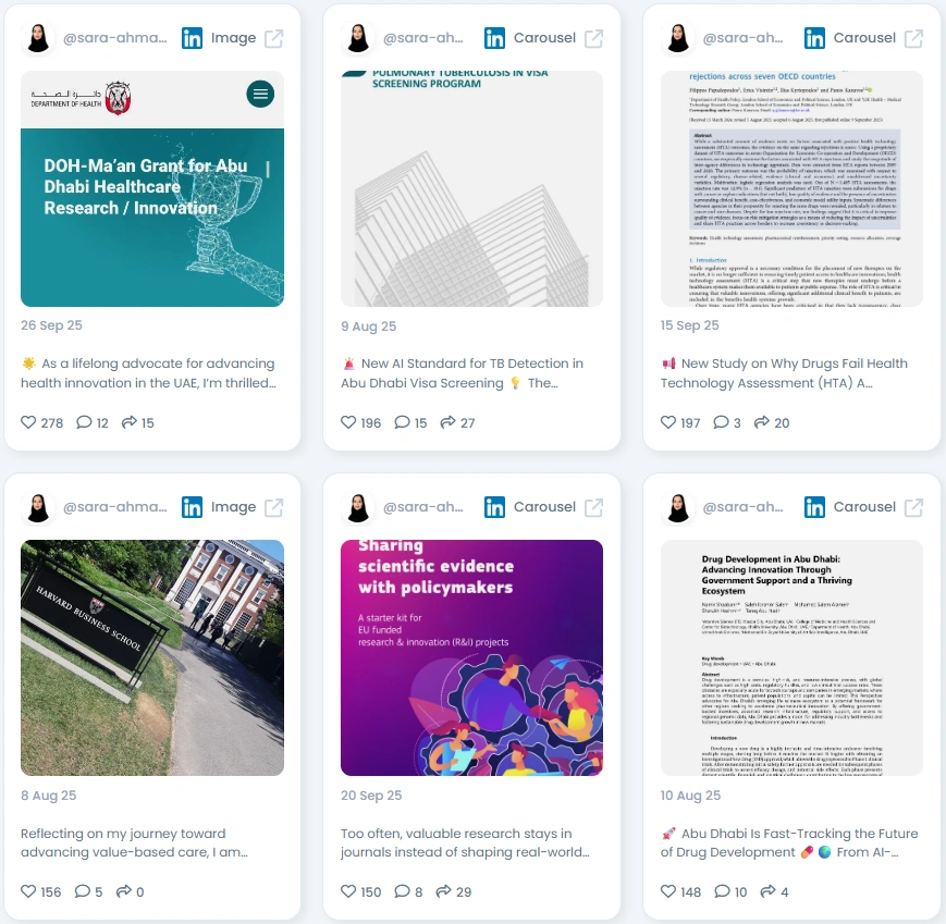 With an Favikon Authenticity Score of 97.5/100, Dr. Sara’s voice is as genuine as it is authoritative. Her engagement comes from meaningful dialogue where policymakers, doctors, and health advocates share experiences and exchange insights. Her posts feature real policy outcomes, data-driven reflections, and milestones from her professional journey. She avoids generic content, focusing instead on thought leadership that invites reflection and collaboration. This authenticity makes her one of the most trusted health professionals on LinkedIn in the UAE.