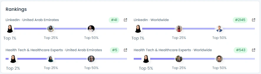 Dr. Sara’s digital presence is supported by impressive metrics. Her follower base has grown steadily from 13,000 to 24,000 over three years, showing consistent community engagement. With an Influence Score of 6,593 points, she ranks #41 in the UAE and Top 1% on LinkedIn for Health Tech & Healthcare Experts. Her engagement quality (88/100) and post content score (92/100) show a strong balance between reach and substance, proving her voice resonates with both professionals and policymakers.