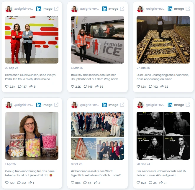 Sigrid champions Climate Change action, Female Empowerment, and Women in Tech and STEM. Her timeline celebrates women crews, engineers, and new leaders across DB. She ties diversity to performance and safety in complex rail operations. Climate posts focus on freight shift as a fast lever for emissions reduction. Education efforts encourage girls and young professionals to build careers in mobility.