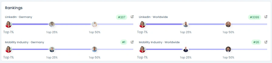 Follower base grew from 76,546 to 95,978 over more than two years with clean organic patterns. She holds an Influence Score of 8,037 pts and posts with steady rhythm. Rankings place her #207 on LinkedIn Germany and #3,399 worldwide. In the Mobility Industry, she ranks #1 in Germany and #26 worldwide. Engagement shows consistent likes, comments, and shares from verified professionals.
