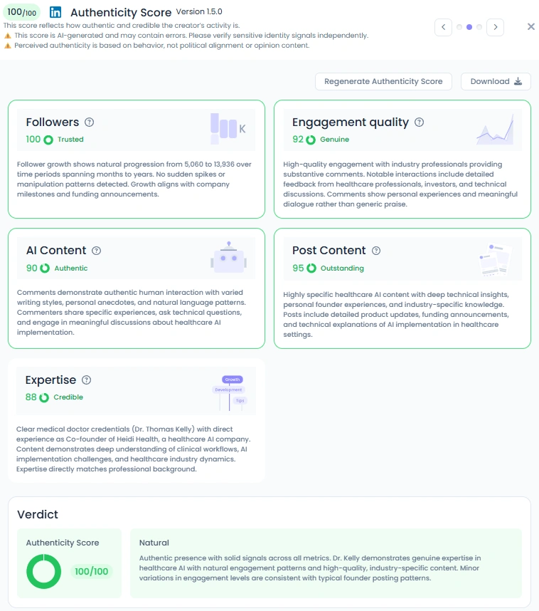 With a perfect Favikon Authenticity Score of 100/100, Thomas Kelly proves that transparency and expertise can coexist. His content feels genuine because it’s built on lived experience. Comments on his posts come from real healthcare professionals and investors who share their own stories and feedback. Each interaction feels natural, showing his ability to lead important conversations without falling into self-promotion. His tone remains calm, insightful, and deeply human, the exact balance you’d expect from a doctor building for doctors.