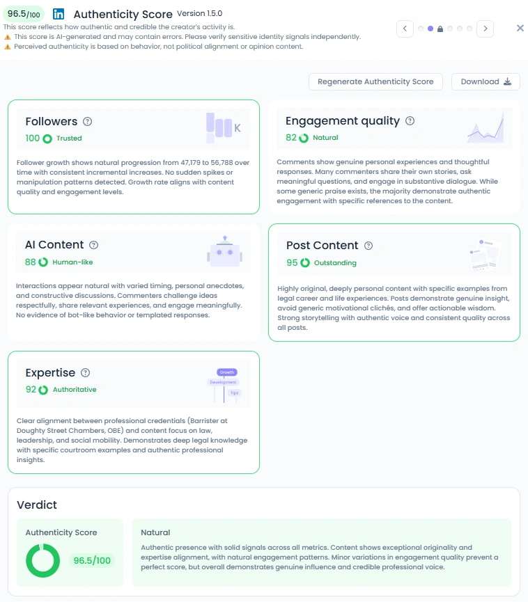 Favikon scores him 96.5/100 for authenticity. Threads include personal anecdotes, respectful challenges, and thoughtful follow-ups. He posts original ideas with specific examples from legal life. No templated language. Just a consistent, human voice.