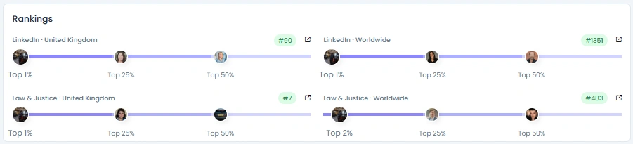 Influence Score: 8,210 pts. Followers grew from 47,179 to 56,788 with steady, organic momentum. Engagement quality sits at 82, AI Content 88, Post Content 95, and Expertise 92. Rankings place him #90 on LinkedIn UK and #7 in Law & Justice UK, with top-tier credibility worldwide.