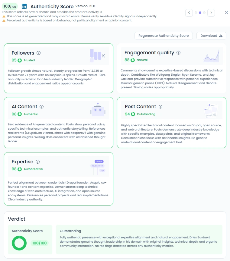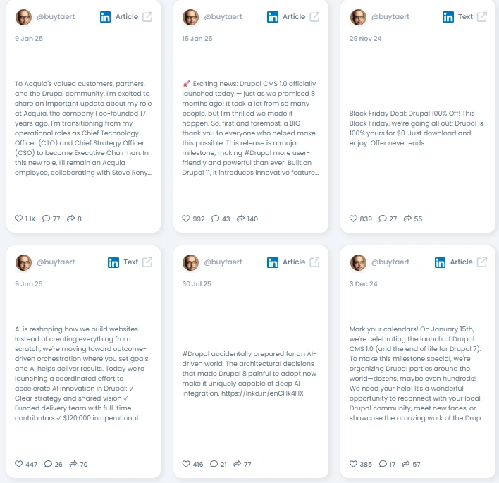 Favikon scores Dries 100 out of 100 for authenticity. His content shows original technical examples, release announcements, and personal perspective rather than generic PR. Posts include measurable milestones, community acknowledgments, and occasional candid commentary. That transparent style builds trust among engineers and executives alike.