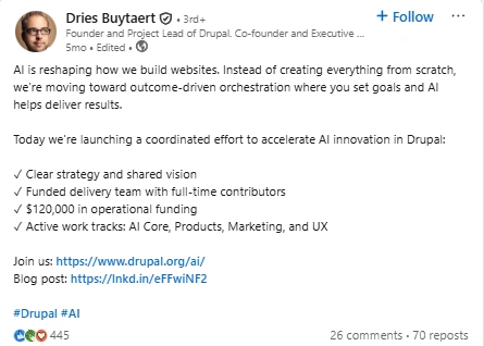 As AI and composable architectures reshape how websites are built, leaders who combine open source stewardship and product delivery will be essential. Dries brings both legitimacy and practical experience to these shifts. He can help projects adopt new capabilities while preserving community governance and long term maintainability. That makes him a strategic partner for vendors, foundations, and engineering teams navigating change.