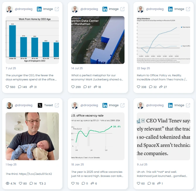 People listen to Dror because he turns data into storytelling. His tone is calm, clear, and often sprinkled with humor. He doesn’t just describe what’s happening; he helps audiences understand why it matters and what might come next. From his breakdowns of work-from-home trends to thought-provoking visuals on the economy, he creates content that sparks reflection and debate. His mix of logic and warmth makes even the most technical topics feel personal.