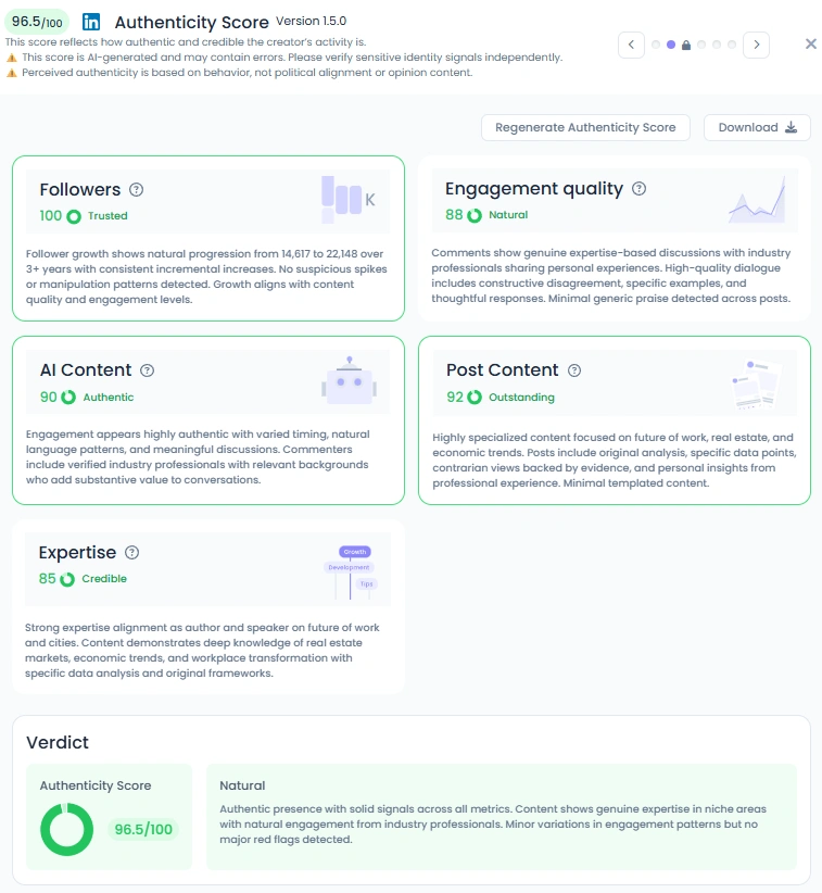 With an Authenticity Score of 96.5/100, Dror’s online presence stands out as both credible and approachable. His AI Content score of 90 (Authentic) and Post Content score of 92 (Outstanding) reflect natural, high-quality engagement. He shares real insights, personal opinions, and occasionally even family moments that humanize his expertise. His authenticity lies in how he balances being an economist with being a curious observer of everyday life.