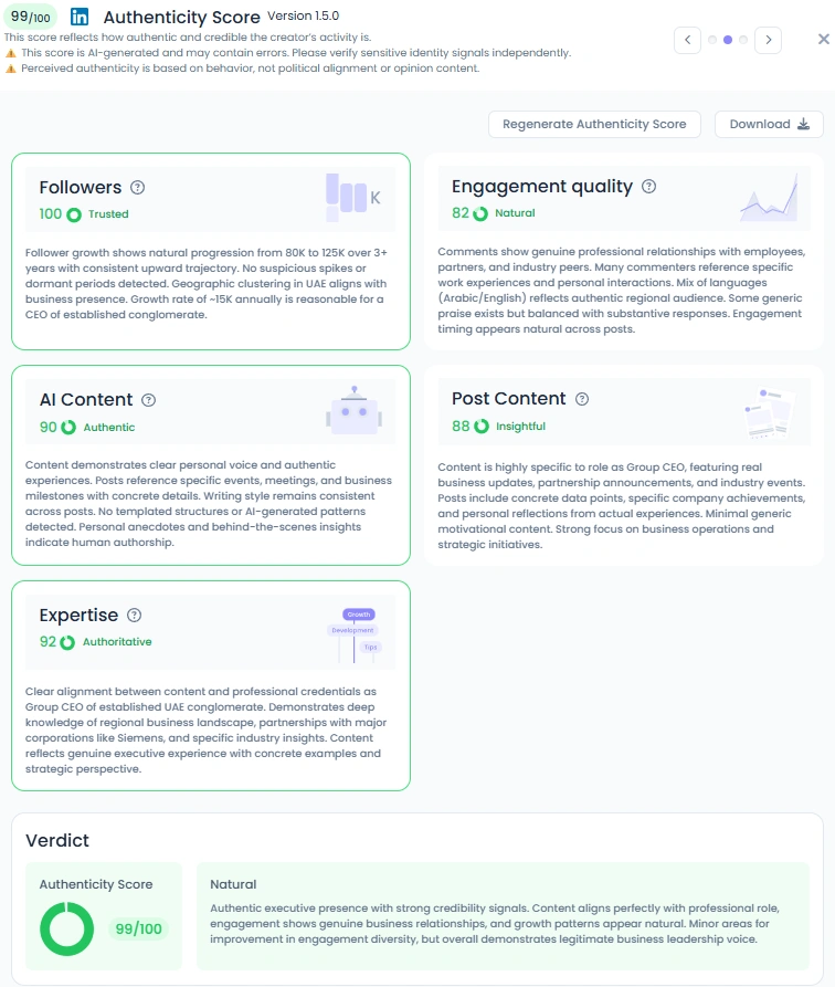 Easa holds an Favikon Authenticity Score of 99/100, a reflection of genuine storytelling and consistent engagement. His posts feel personal yet professional, combining behind-the-scenes moments with insights into corporate life. The mix of English and Arabic commentary creates regional authenticity, connecting both global and local audiences. His interactions are driven by meaningful dialogue with peers and employees, showing that influence built on sincerity endures longer than trends.