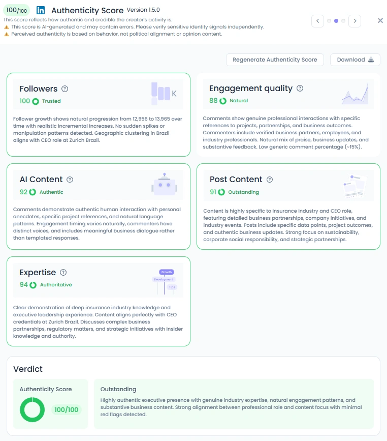 Edson scores a perfect 100 Authenticity Score. His feed contains genuine team moments, leadership reflections, and project highlights rather than empty corporate slogans. Comments come from employees and industry partners who reference real collaborations and outcomes. That pattern shows authentic leadership amplified by meaningful human interaction.